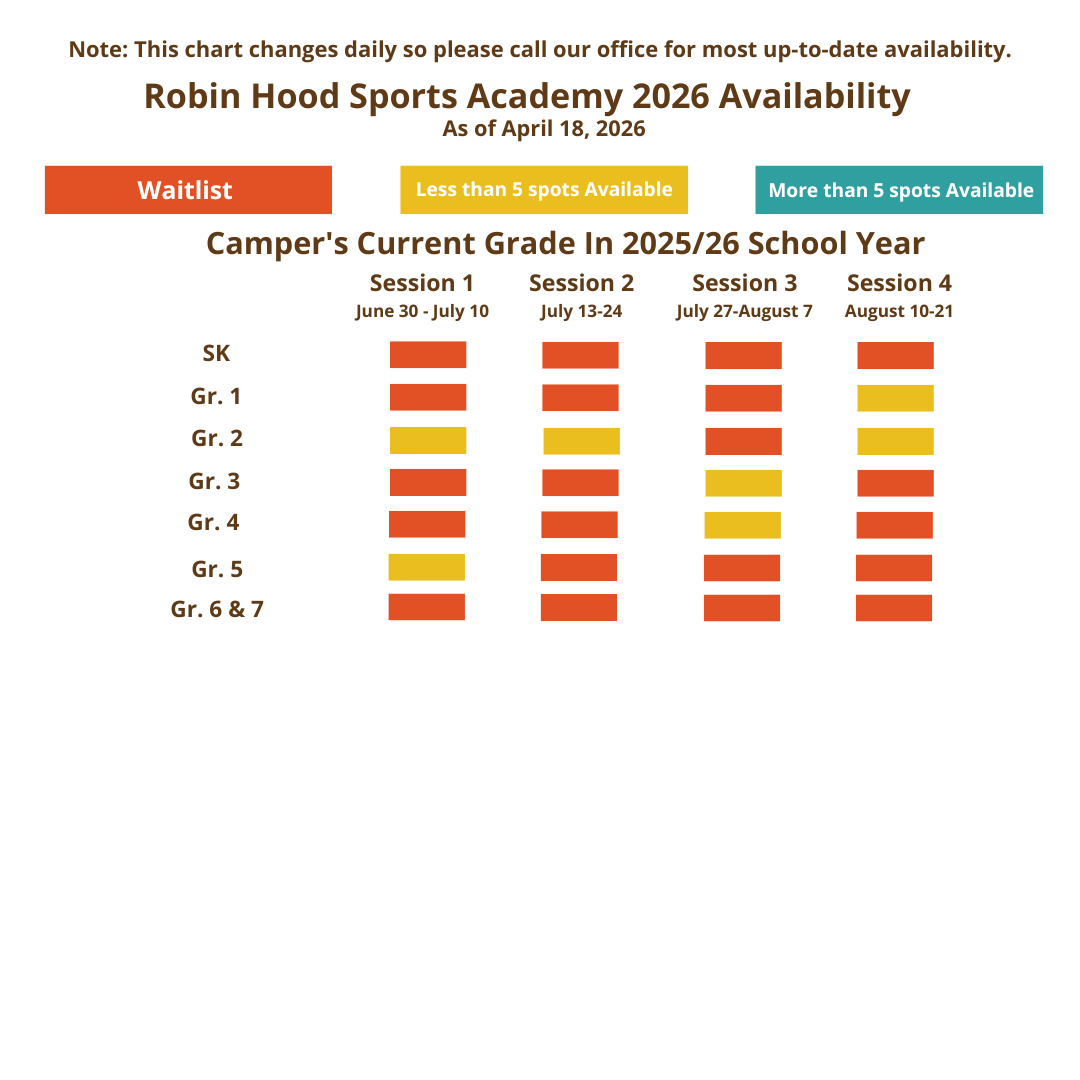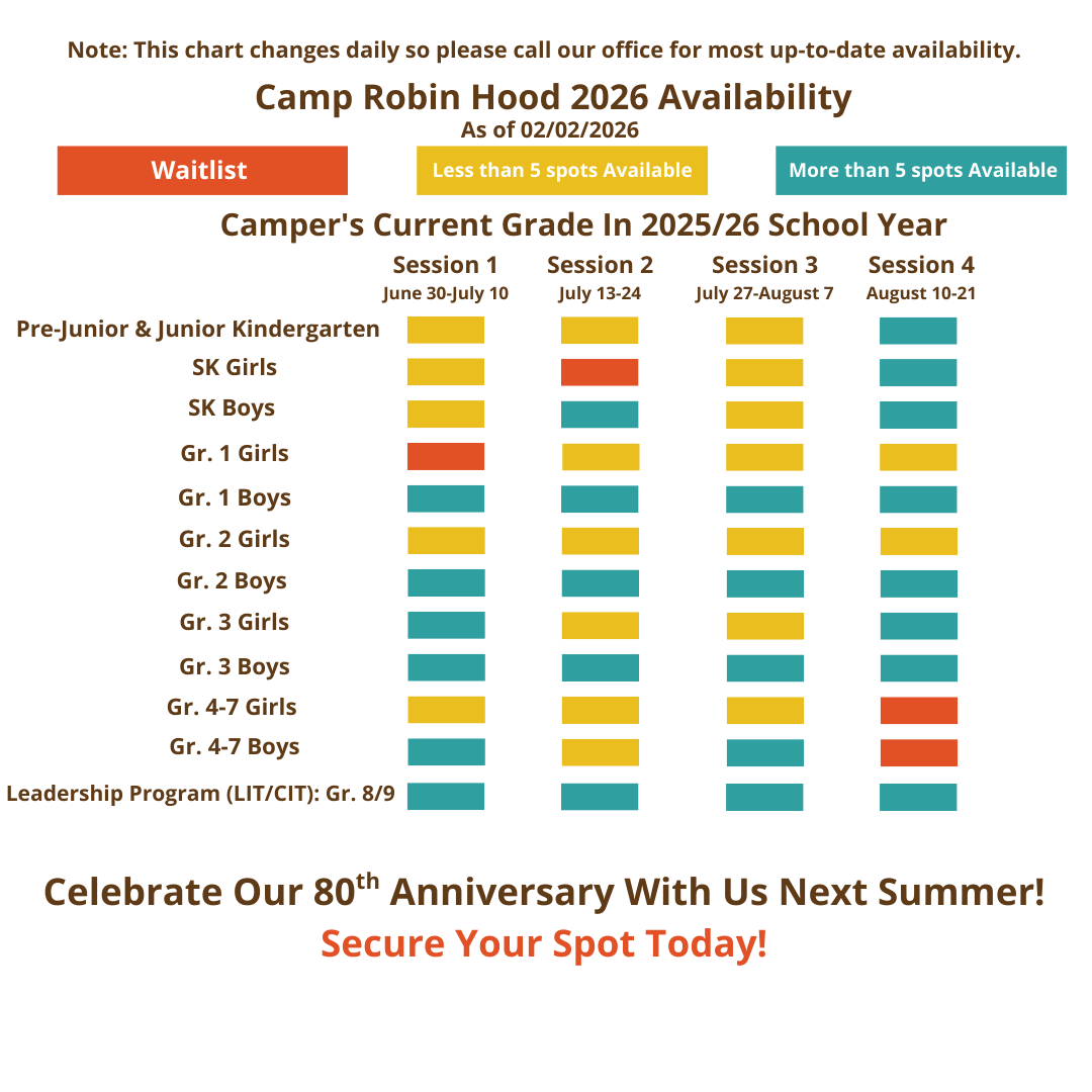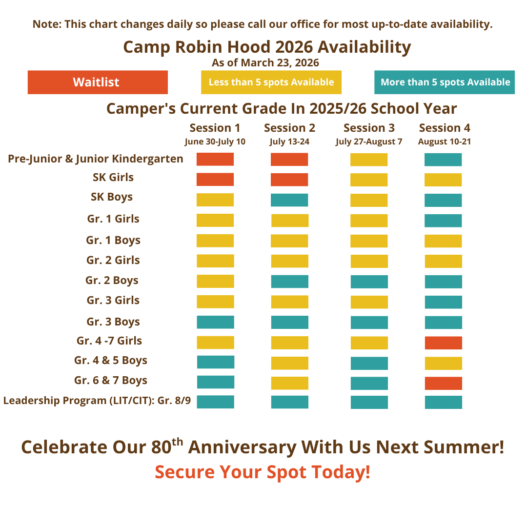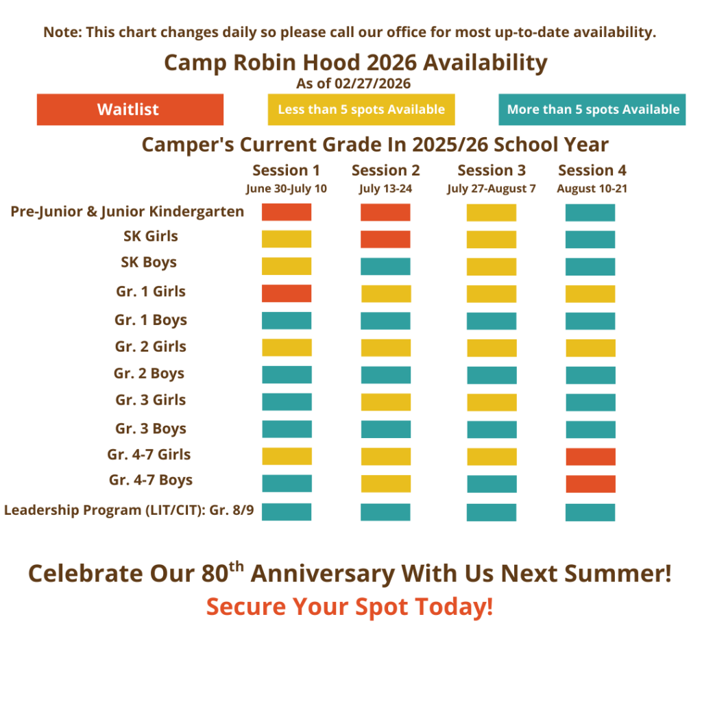 We encourage you to submit your application today! As you can see from our availability grid below, there are limited spaces in some age groups at certain times during the summer. Should your preferred session in your child’s age group be sold out at this time, you are invited to submit an application and join a waitlist. If a spot opens up, Patti, our Registration Director, will be in touch. Please feel free to reach out to her by e-mail or phone at 416-736-4443 should you have any questions.