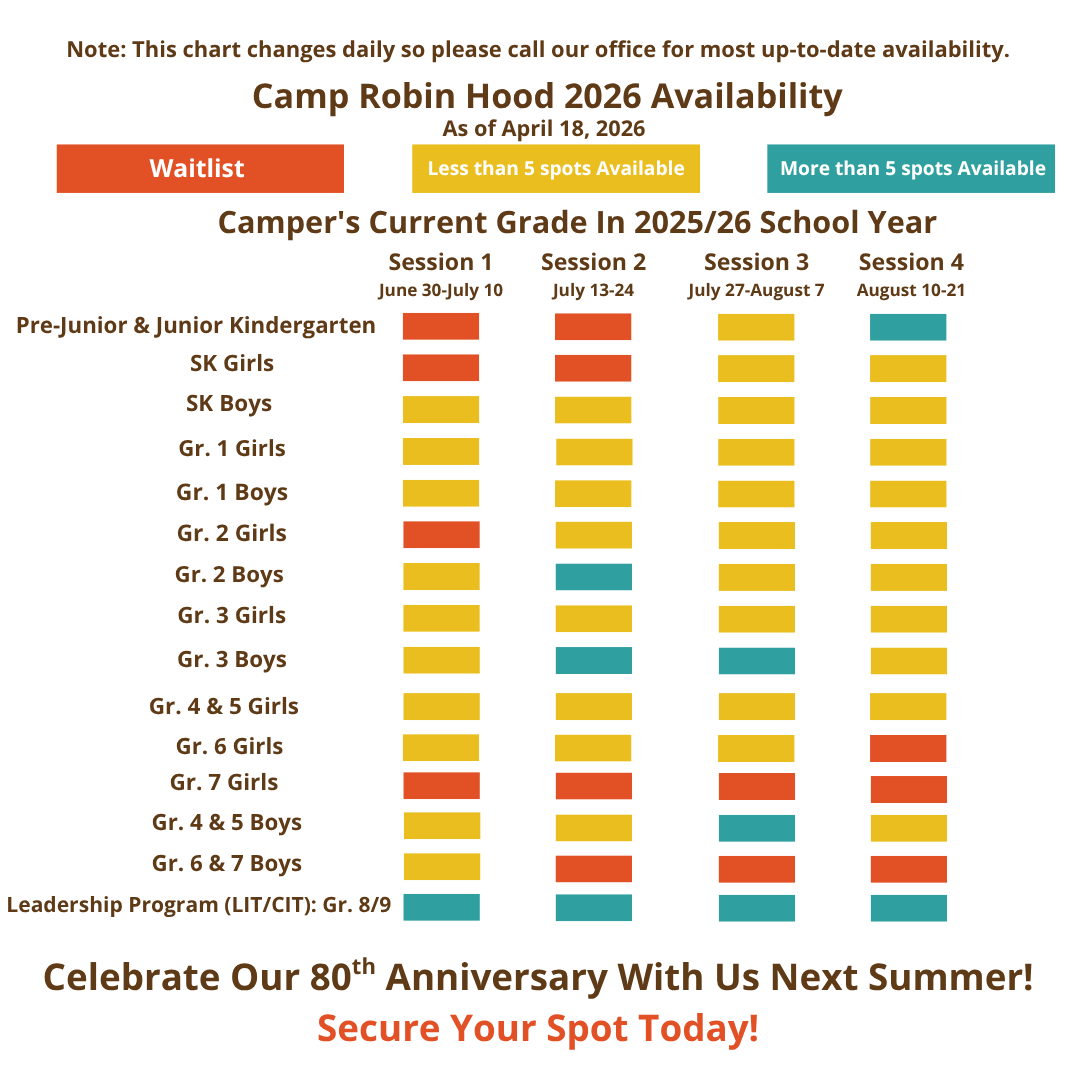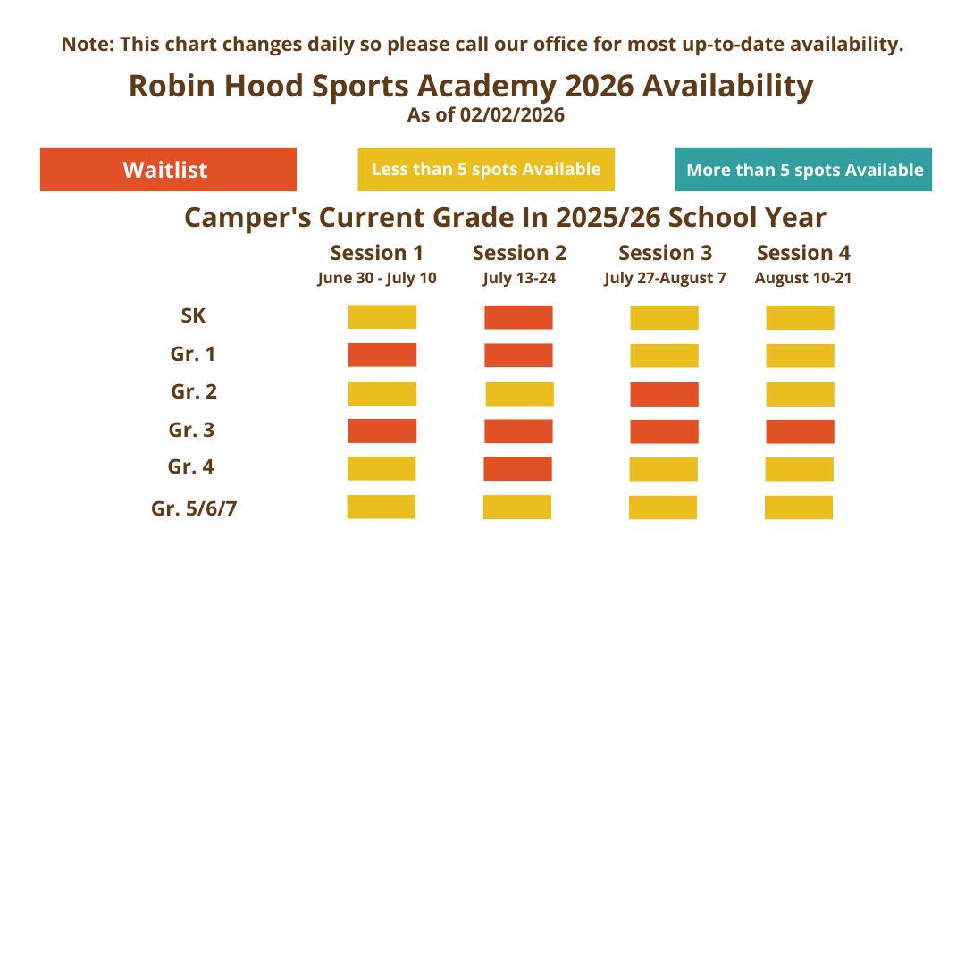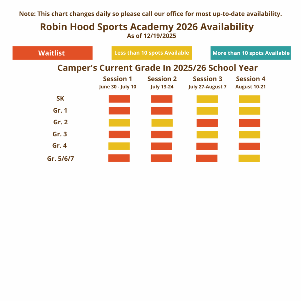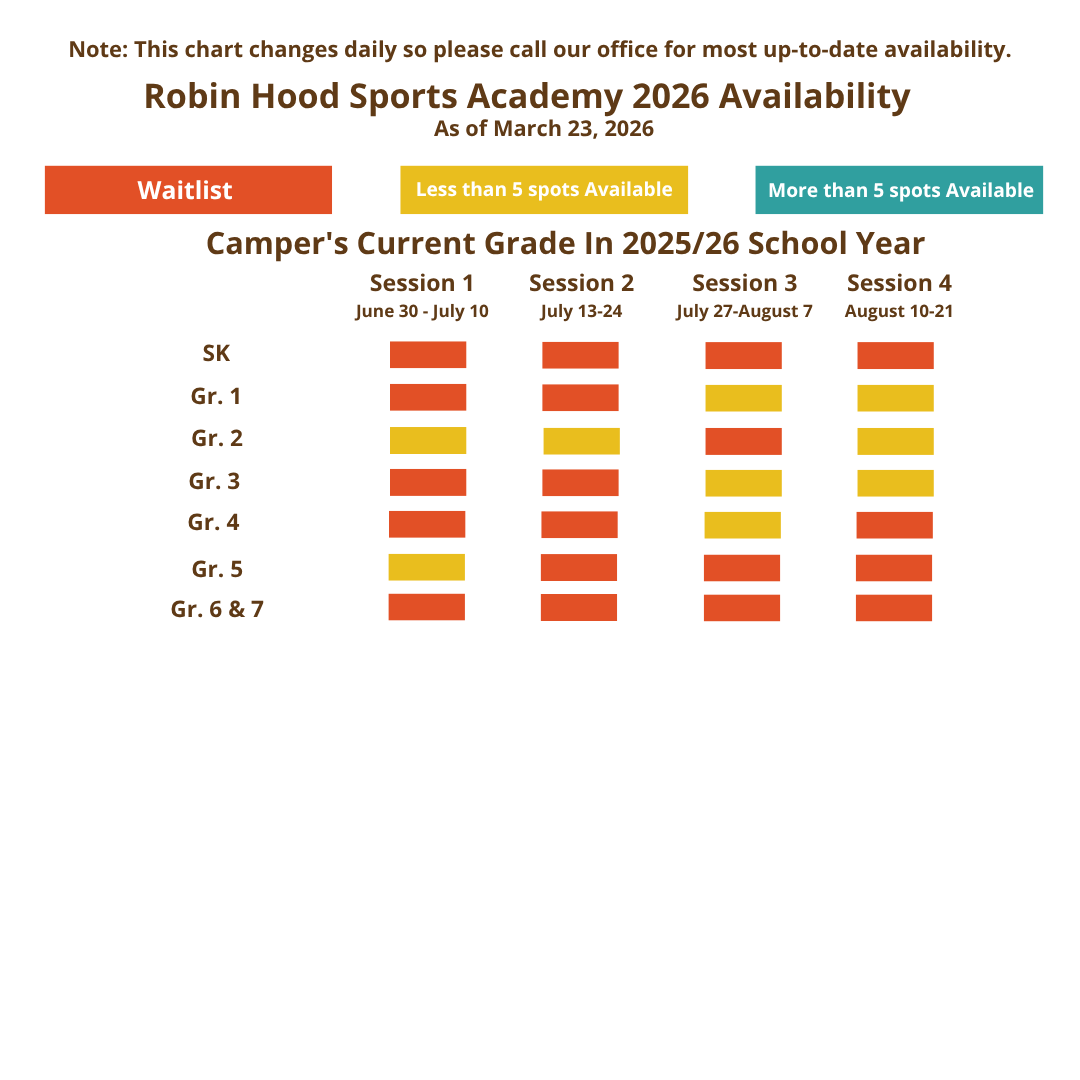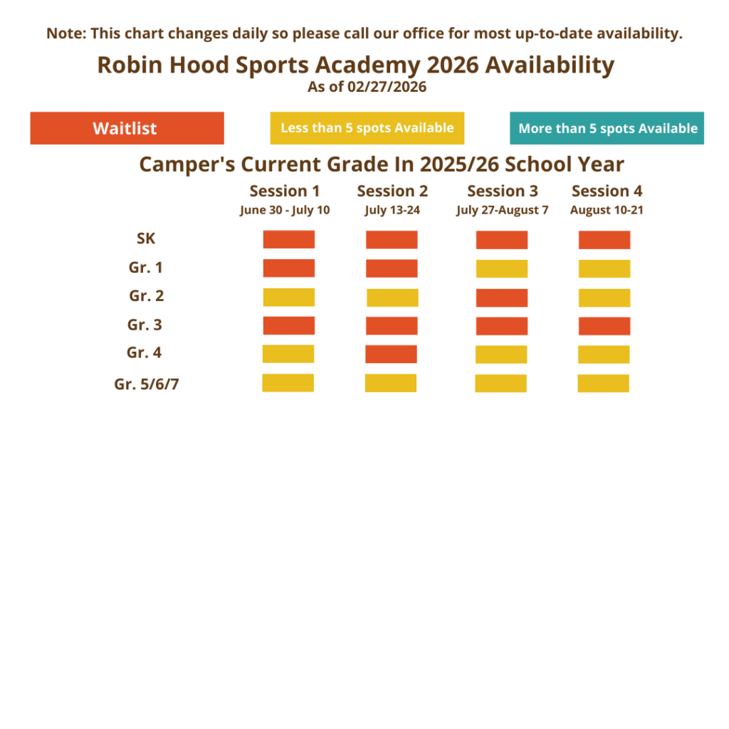 We encourage you to submit your application today! As you can see from our availability grid below, there are limited spaces in some age groups at certain times during the summer. Should your preferred session in your child’s age group be sold out at this time, you are invited to submit an application and join a waitlist. If a spot opens up, Patti, our Registration Director, will be in touch. Please feel free to reach out to her by e-mail or phone at 416-736-4443 should you have any questions.